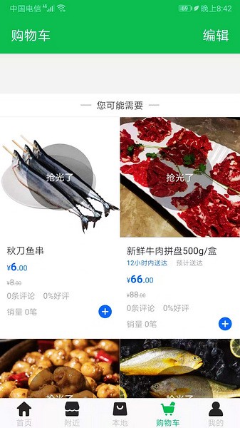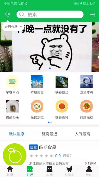 3、可以直接通过附近搜看,离用户最近的美食、水果、以及酒水饮料等,方便用户进行购买。