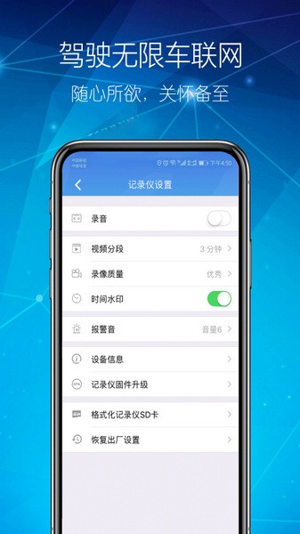 一键连接行车记录仪,能够在手机上观看行车记录仪拍摄的画面。