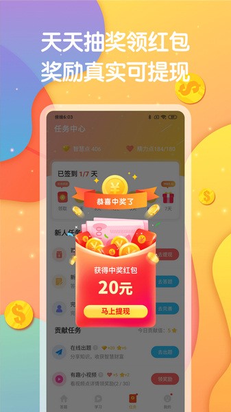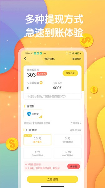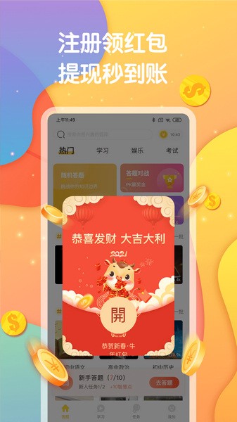 1、新人注册领现金,提现秒到账 首次注册答题赚钱领取新人红包奖励,当天提现无门槛秒到账,每一笔收益实时更新