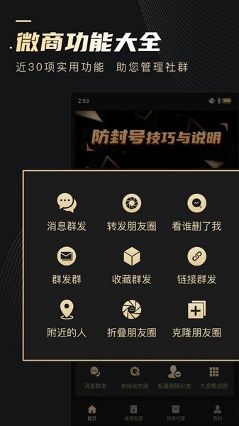 1.拥有多种功能,囊括群发消息、拍照加好友、通讯录加入、群内加好友、多开等,让你玩转微商行业;