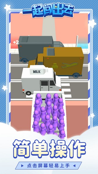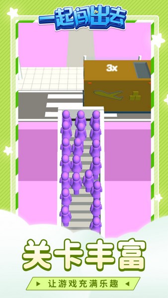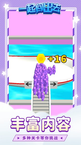 一起闯出去是一款比较休闲简单的跑酷游戏,这里有着非常复杂多变的场景,但是操作起来是很轻松的,只需单手点击屏幕就可以完成操作。和传统跑酷游戏不同的是,在这里玩家需要控制非常多的角色,玩家可以在沿途拯救这些角色,并让自己的团队壮大。路途中是有很多机关的,尽可能别让他们受伤,带领他们冲出险境,并成功登上撤离的船只。