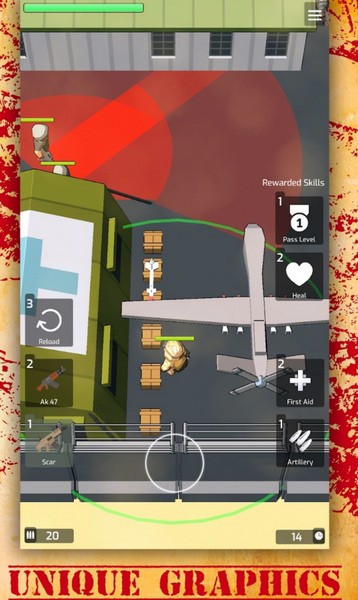 2、在每个关卡中都能体验精彩射击大战,大量敌人将会从多个方向出现,你要全力作战。