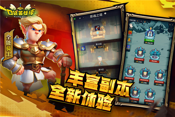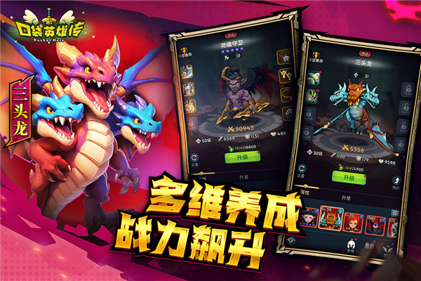 3、轻松的挂机系统: 游戏内置了无脑挂机自动闯关功能,口袋英雄传玩家可以轻松挂机,上线收菜一夜暴富。挂机一段时间后,只需动动手指,就能收获海量奖励。