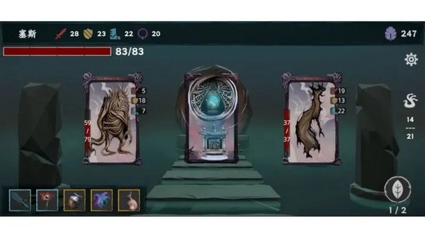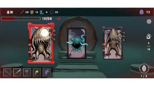 游戏中,卡牌分为攻击、防御和特殊类型,而事件则包括陷阱、宝藏和随机触发的情节。战斗中遇到的怪物种类多样,像触手怪、深海鱼人这些克苏鲁风格的生物都挺有特色。此外,游戏还加入了“混沌值”机制,玩家的理智会因为怪物攻击或特定事件而下降,甚至可能陷入混乱状态。