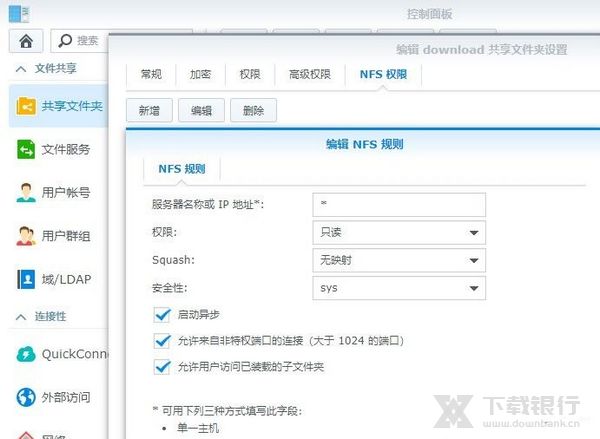 4、注意权限问题,如果没有给读取权限,会无法选择文件夹。例如群晖NAS需要在共享文件夹里设置NFS权限,按下图方式设置: