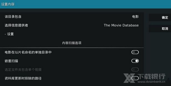 6、“该目录包含”设置视频源的内容类型,如果该视频源是电影目录,就设置为“电影”;电视剧就选“剧集”;“选择信息提供者”就是设置搜刮器来匹配海报墙,默认是The Movie Database(设置方法),也可以去插件里安装更多刮削器。