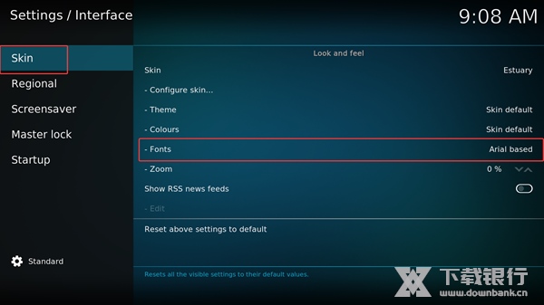 2、首先进入Skin,移动移动▲和▼将Fonts字体更改为Arial based;