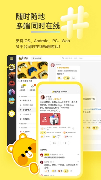 好说APP是一款在线社交软件,其专为喜欢游戏的用户打造,无论是想要找人开黑,还是结识更多好友,都能通过这款软件进行实现,其汇集了众多游戏玩家在线尽情互动,同时还会为用户实时带来与游戏相关的最新动态,更能自由发帖分享心得,更多热点为你带来无限精彩!