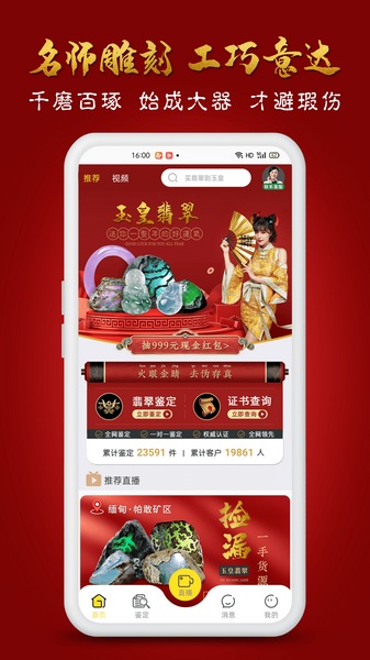 玉皇翡翠是一款翡翠玉石专业直播平台,线上线下一体销售,源头直供APP。矿主对接直播现场卖货,提供第三方担保交易服务,每一款货品都由专业主播层层把关,出国家级鉴定证书,支持全国复检!平台多名资深评估师,鉴定师,在线给你提供买货小技巧,买翡翠玉石,我们更专业!