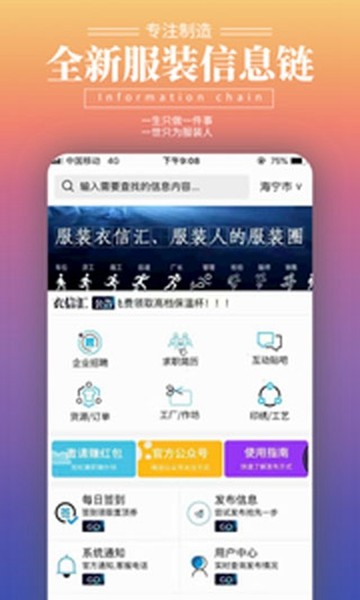 服装衣信汇,由杭州衣信汇信息技术有限公司于2019年打造而成,始终坚持以市场为导向,以用户为中心,诚信为本,开拓创新,便捷服装,以优良的信誉体系,来打造更完善的,绿色服装信息诚信平台。致力于为服装制造业中下游及个人而提供信息服务,采用最先进的移动互联网技术,搭接全方位服装信息资源体,为用户持续性的创造更多机会于价值,努力帮助中下游及个人获取更多服装资源,全程无任何收费区域,免费对外开放。