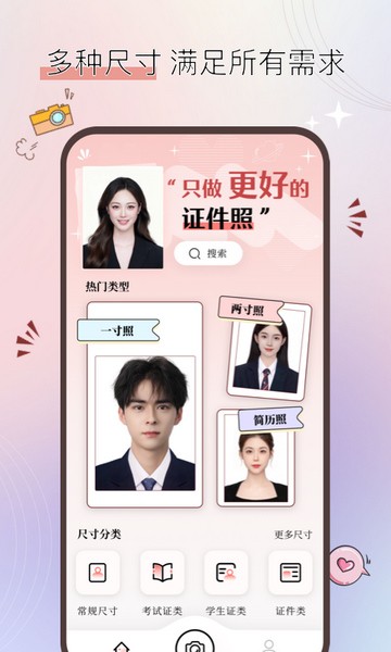 大头证件照电子版app是一款专业实用的证件照制作软件,在这里,不仅能够为你提供上百种系统专业尺寸库,方便你一键进行各种智能美颜并快速替换多种有效背景,轻松为你拍摄出最专业合格的最美证件照,而且内置人像识别功能,可以完美满足你对自然妆、清新妆以及元气妆、男女神妆等各项需求,同时支持自定义妆容程度,便于懒人与手残党一键式快速化妆。