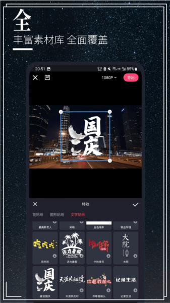 多种贴纸,字幕字体、样式,视频海报,各种背景音乐。
