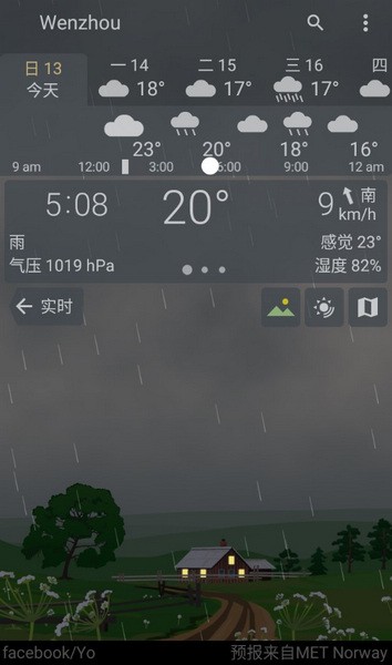 YoWindow最吸引人的地方在于它使用动态景观来反映当前的天气状况。当你的窗外正在下雨,那么在YoWindow里面也会跟着下起雨来。在YoWindow中,日出日落与现实生活中完全同步。YoWindow最奇妙的是你可以提前预知未来的天气。而且您只需轻轻扫过屏幕,你就可以看见一天之中的天气变化。当然,您也可以选择一个最适合你所在地区的景观。