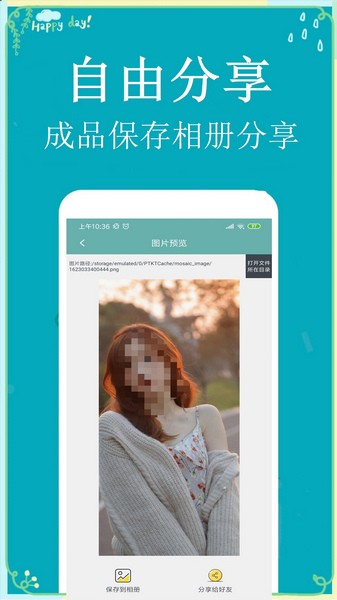 照片马赛克:图库中选择照片进行处理,手指涂抹的区域马上就变成了马赛克。保护自己的隐私不被窥探!