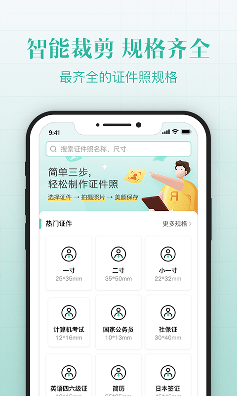 涵盖生活中可能用到500多种证件照规格,不论您需要常规的寸照,还是需要各国签证,甚至市面上绝大多数考试在内的各种报名照,都能在这里制作。