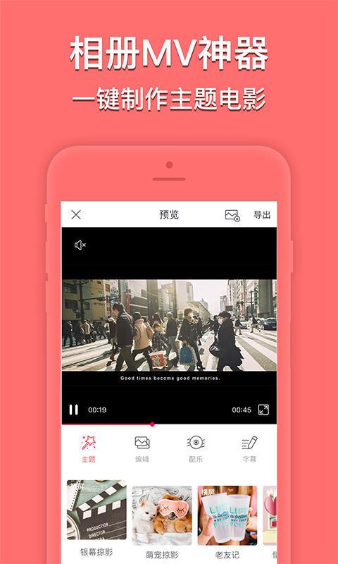 【打造专属影片】主题中的音乐、文字均可随意切换,把你的想法融入到影片中!