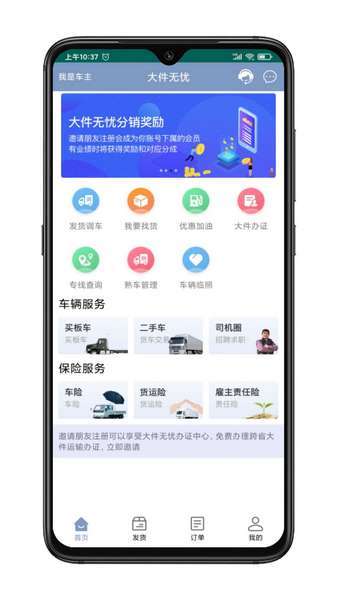 大件无忧APP是一个专门为物流货运行业打造的神器,无论是货主还是货车司机都能在这里找到方便。对于货主来说,这里可以轻松发布订单,而且每个司机都经过严格审核,让人放心不少。而对于货车司机来说,这个平台简直就是福音,不仅可以直接接单避免空车跑路,还能在线找货、办理证件、查询路线,甚至还能邀请好友一起用,不仅能帮忙拉活,还能拿到奖励,完全不用愁收入问题。