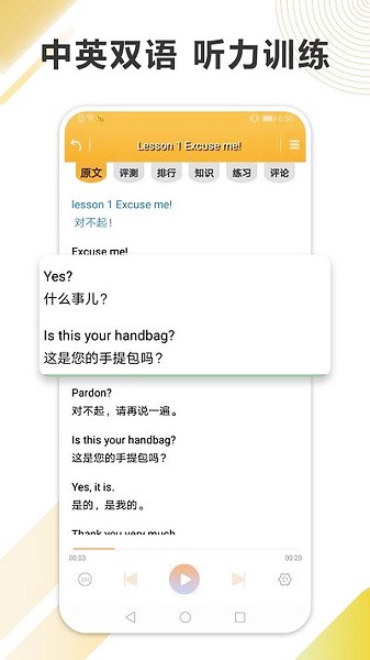 5、单词是英语学习的关键,对于不认识的单词,您可以在听的同时选词查看释义,可以听发音,并能添加到生词本。