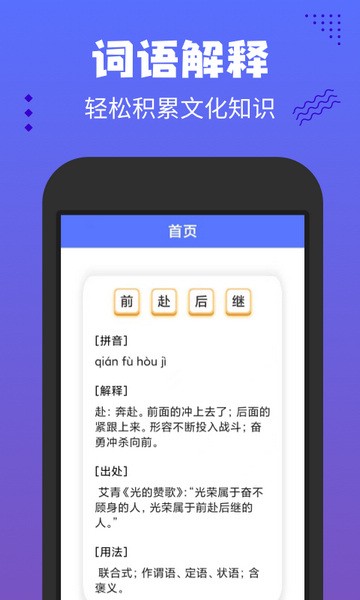 寓教于乐的诗词成语知识答题软件,拥有着极其丰富的诗词和成语,用户在进入之后需要根据前后所给的提示来进行填写,组成正确的诗词或者是成语,同时还会为每个成语进行解释,让大家更好的了解到其所表达的意思,在进行答题的同时还可以不断的学习到更多的知识,玩法简单有趣,只需通过点击,即可将诗词连线,寓教于乐,老少皆宜