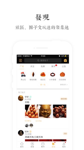 APP的功能也很强大,比如商家认证、即时通讯这些功能让买卖更安心,结交好友也更容易。特别是“晒出完美包浆”和拍卖活动,简直让人停不下来!还有文玩大咖分享的专业文章,涨知识又有趣。