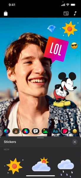 • 为照片和视频片段添加动画表情符号、对话气泡、图解贴纸和形状