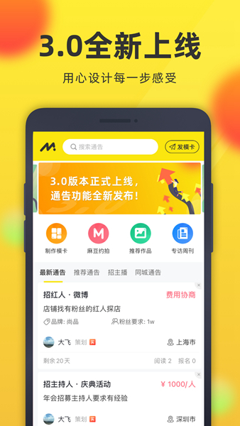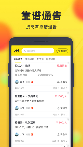 企业经纪可以在平台发布活动通告与招募信息