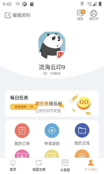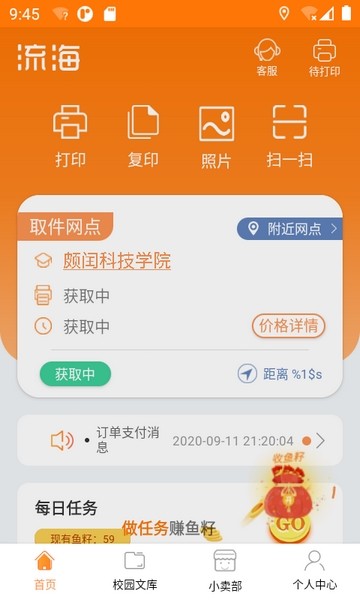 软件还有一些特色功能,比如校园文库,里面有海量资料可以下载和打印,还能分享赚鱼籽,感觉对学生党特别友好。首页界面清爽简洁,操作起来也顺手。上传文档的时候分类很明确,黑白、彩色随便选,支持的格式还挺多的,基本满足日常需求。