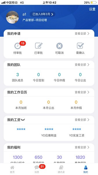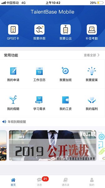 1、提供GPS打卡、休假、公出、补签考勤、申请管理、工作日历、加班、提案、加气、学习需求、工资、福利、消息通知、通讯录等一站式移动办公服务;
