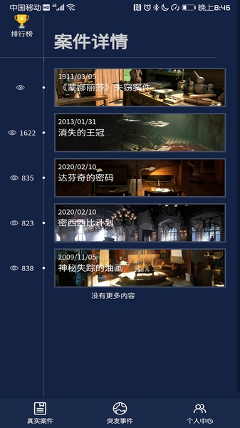 新手可通过选择模式快速上手,参与情景推理或语音房互动,主持人会根据推理结果发放奖励。App还设有真实案件区,收录全球未破疑案,配以现场照片和评论功能,吸引侦探爱好者讨论分析。