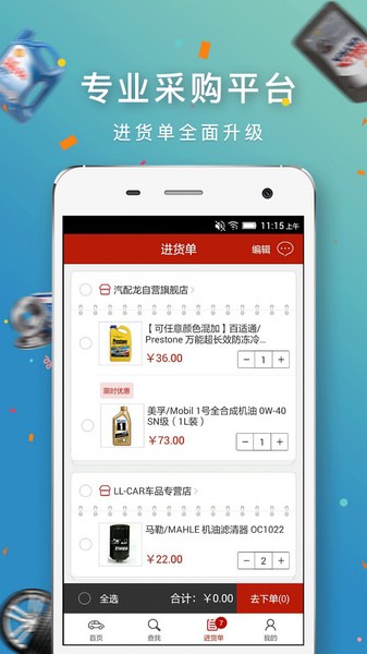 整个软件涵盖的商品包括了维修保养、美容清洗、车载电器、汽车装饰、安全自驾、工具设备等,还有有高频的机油、发动机配件,低频的轮胎、火花塞、刹车片、刹车盘、变速箱油等也应有尽有,软件上所有商品不用上门订货,直接下单便能送货上门便捷又方便,是更多精明老板的不二选择!