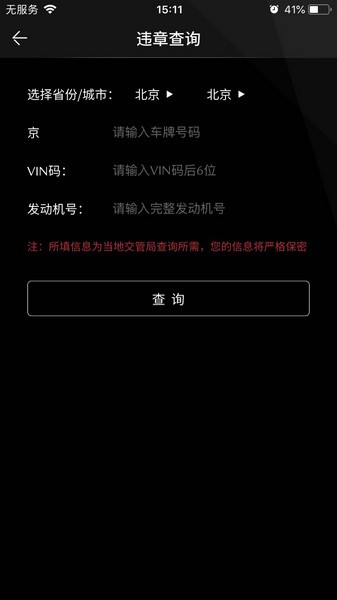 6. 违章查询:车主输入车辆基本信息,可查询爱车违章情况;