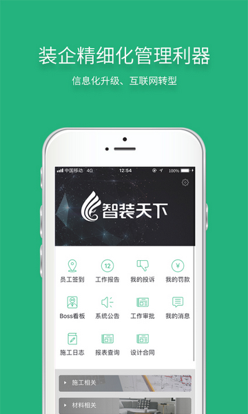 智装天下app是一款国内目前最专业的装饰企业ERP管理软件,专为相关人士提供最符合装饰企业管理特点的行业综合解决方案,在规范管理的同时,彰显个性,树立品牌。智装天下ERP现已全面打通PC电脑端、手机APP及微信端,极大的提高了家装公司的品牌形象及竞争力。软件覆盖整个家装企业全部核心业务流程,登陆后即可进行客户关系管理(CRM)、预算报价、施工计划/巡检、物料申报/控制、智能资金收付、智能报表分析以及手机签到/签离等。
