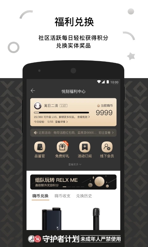 除此之外,RELX ME还有不少实用的小功能,比如新手指南、蓝牙绑定设备、了解新品动态和优惠活动等。这些设计都很贴心,尤其是积分兑换系统,让人感觉玩手机的同时还能赚点东西,挺有意思的。