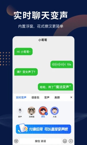 实时变声区别于录音变声功能,不是先录音再变声,而是一边说话一边变声,省时省心!可以切换至汤姆猫、萝莉、大叔等音色,在视频通话、语音通话中都可以实现哦~