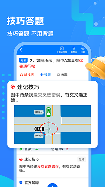 懒熊驾考通过多年对驾考考题的总结和分析,同时借助全新的大数据和AI技术,总结出一套简单高效的“傻瓜式”答题技巧,不用死记硬背就能快速通过考试。