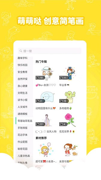 这个软件是专门给小朋友用的,里面有很多主题的手抄报模板,还有各种好看的边框、插图和简笔画素材。最棒的是还有教学视频,教孩子们怎么画简笔画,特别适合零基础的小朋友。而且内容还挺全面的,什么节日节气、校园生活、安全健康都有涉及。