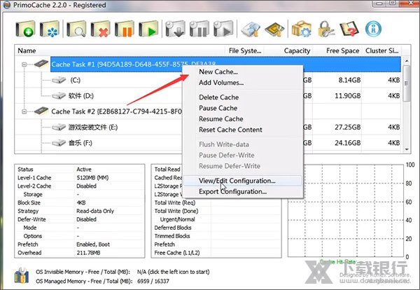 primocache官方版是一款盘系统优化软件,它可以给用户们电脑的系统进行非常不错的优化,能够轻松方便地应用于诸多场景和领域,支持永久二级缓存、TRIM指令等,内置自适应智能缓存调度算法,快速、高效、安全地对存储设备进行读取扫描。除此之外,还支持多种缓存策略以及灵活的缓存设置,可轻松为您的物理硬盘创建缓存,提高硬盘的读写性能。