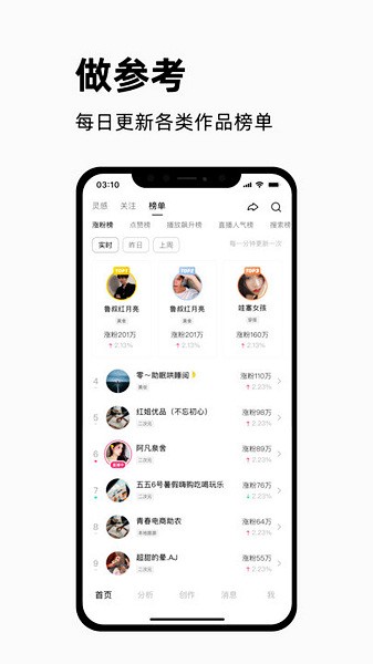 【榜单参考】提供点赞榜、涨粉榜、播放飙升榜等多维度作者榜单,聚集优质账号,提供创作参考。