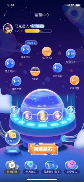 在能量中心任务栏中(花点时间、学点知识、薛定谔的盒子、交个星人等),可以获取无限的能量来制造晶石,获取卡牌,兑换光点