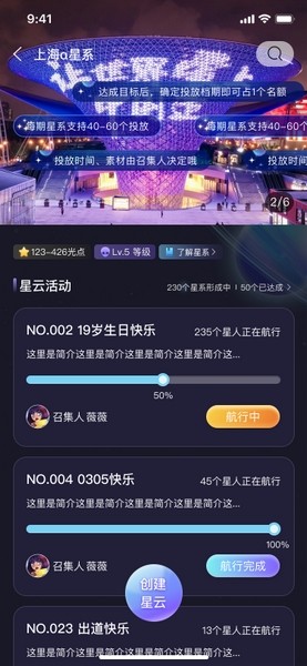 星人通过【虫洞】,可以选择想要点亮的地标灯光秀星系加入并开启航行。在航行截止日前,成功创建专属星云并完成召集任务