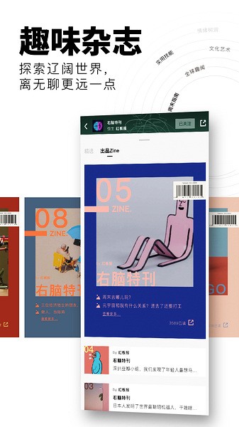 界面设计也很棒,翻页效果像读杂志一样,视觉体验很好。另外,它还有主题社区和话题活动,用户可以发布自己的想法,与其他用户互动,感觉特别有参与感。
