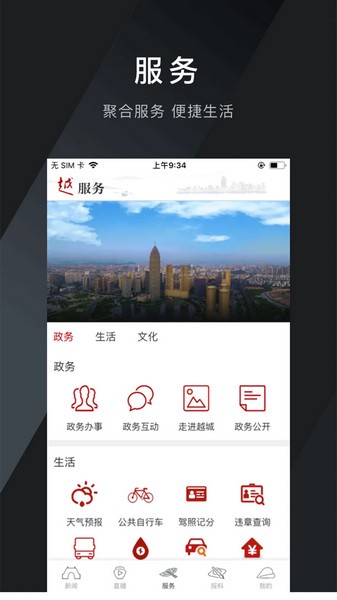 今日越城app是一款专为绍兴越城当地的用户打造的新闻和资讯阅读平台,还有各种便民政务服务能够提供为大家。平台上的服务涵盖了大家日常生活的方方面面,用户不仅能够获得最近一段时间内的天气预报,也能够查询自己的违章情况。大家还能够在线收看直播节目和报料各种新闻线索,以及将自己身边的各种大事和小事分享到平台上和网友们一起交流讨论。