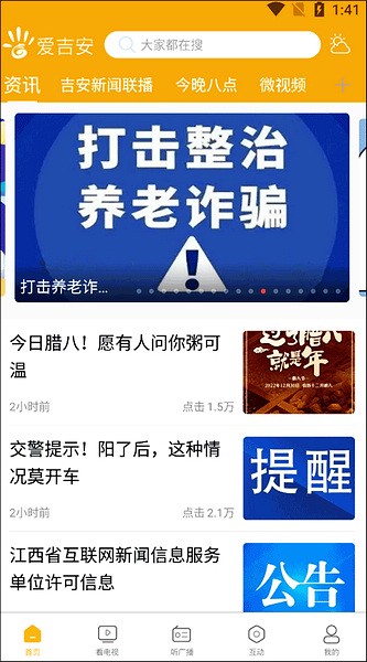 爱吉安app是由吉安广播电视台官方打造的一个移动新媒体平台,为用户们打造了集视听、资讯、信息、便民服务、社区生活于一体的平台,通过该软件大家可以实现查询天气、号码通、查询文章、购票、实时公交等便捷的功能,让市民们的生活更加智能化、特色化。同时大家在爱吉安当中阅读新闻,观看电视直播的时候,还能够在其中进行互动,分享自己看法和见解。