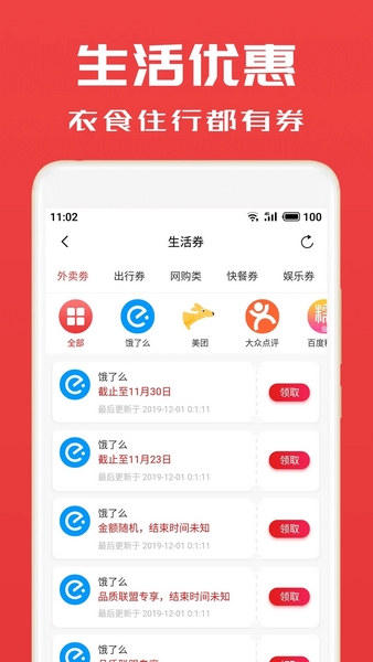 生活优惠券功能,大量的出行、网购、快餐、娱乐劵可以任你领取;