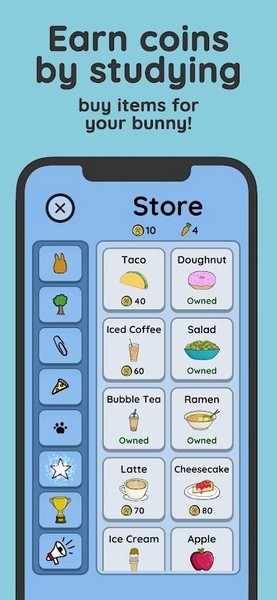 这款Study Bunny软件真的超级有意思!它的界面设计得超萌,特别是那个可爱的兔子形象,让人忍不住想一直盯着看。最让我喜欢的是它把时间管理变成了一个游戏,比如通过赚取金币来装扮兔子的家或者解锁新的背景,这样一来学习也变得有趣多了。