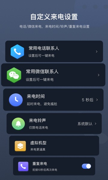 这个app还有不少亮点,比如支持微信界面模拟,还能读取你的通讯录随机来电,听起来有点搞笑但也挺方便的。最棒的是操作简单,界面清爽,即使不太会用手机的人也能快速上手。你可以把它当作聚会时的“救命稻草”,或者用来实现一些小小心愿,比如假装偶像明星或暗恋对象给你打电话。