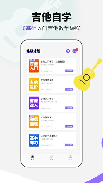 2、吉他教程,软件提供了新人的扶持计划,让你就能看见有很多的学员都是免费的去学习,从小白到弹唱高手