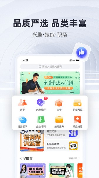微师APP是一个很不错的在线教学软件,无论是学员还是老师都能在这里找到自己需要的服务。这个平台涵盖了亲子、职场、四六级考研、书法、兴趣技能等很多课程类别,适合各个年龄段的人学习。我觉得这对想要提升自己的人来说是个好消息,因为可以随时随地打开APP学习。