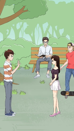 第一关 点滑板男的滑板和点开树丛后读书郎的眼镜,把滑板和眼镜给男生