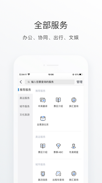 1、丰富的服务划分栏,里面的服务划分了推荐服务、奥运服务以及文化旅游等多种类别;